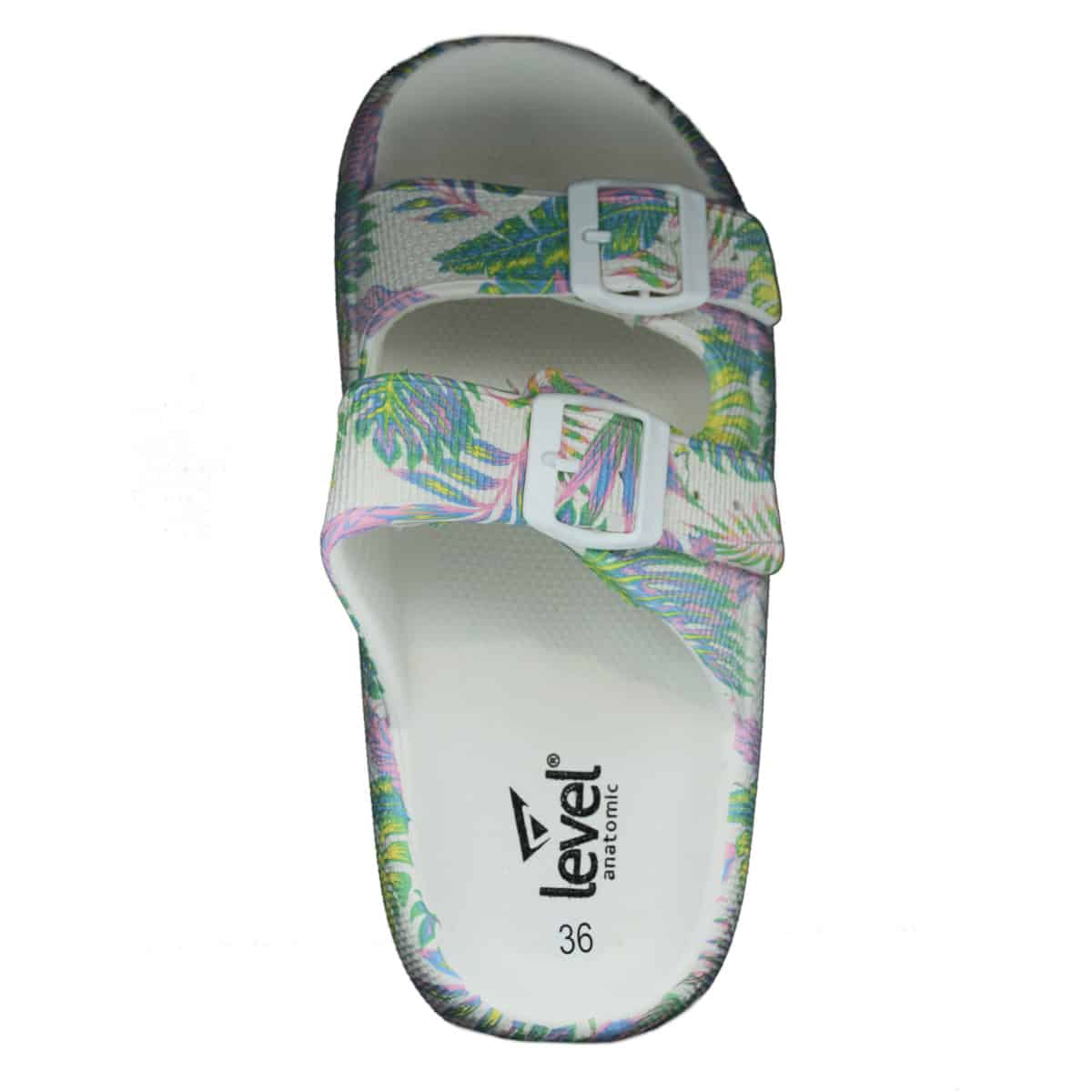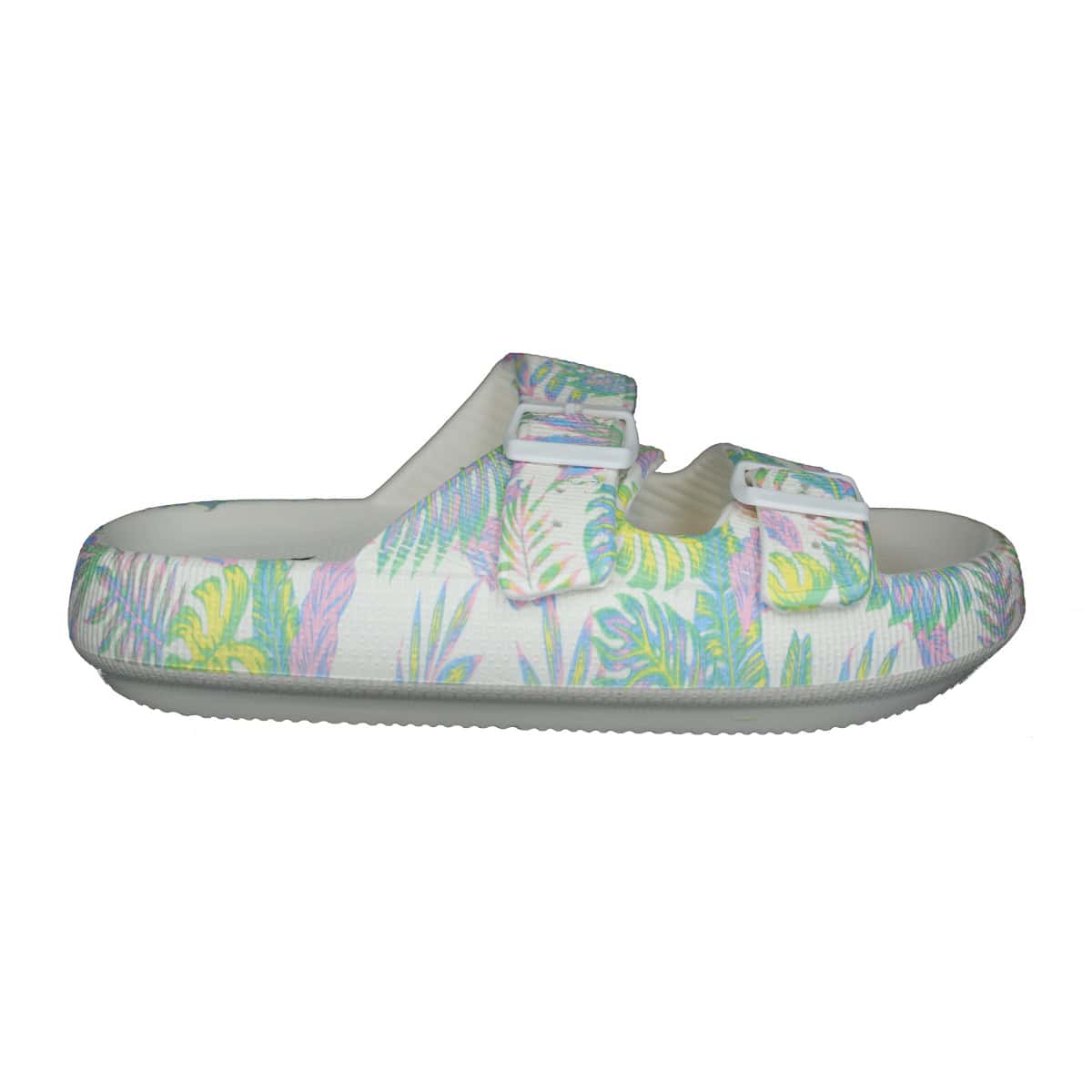 Γυναικεία σαγιονάρα με σχέδιο και δύο φάσες. Ρυθμίζεται με αγκράφα για καλή εφαρρμογή στο πόδι. Ιδανική για παραλία και καθημερινή χρήση. Ανατομικό πέλμα και αντιολισθητική σόλα. Ύψος τακουνιού 3,5cm.