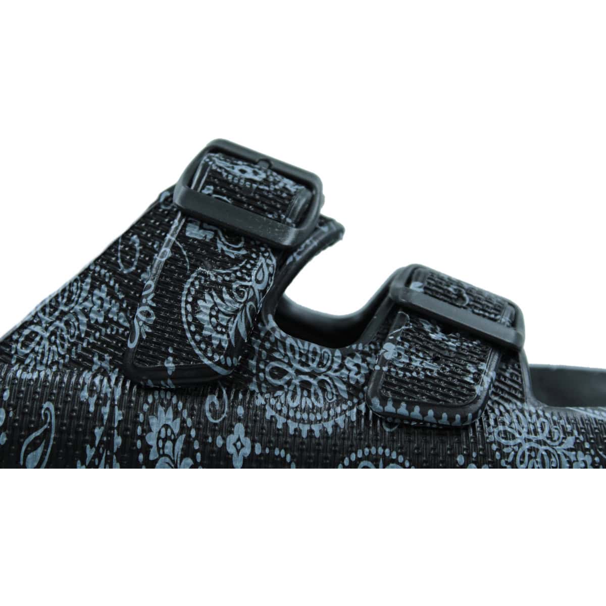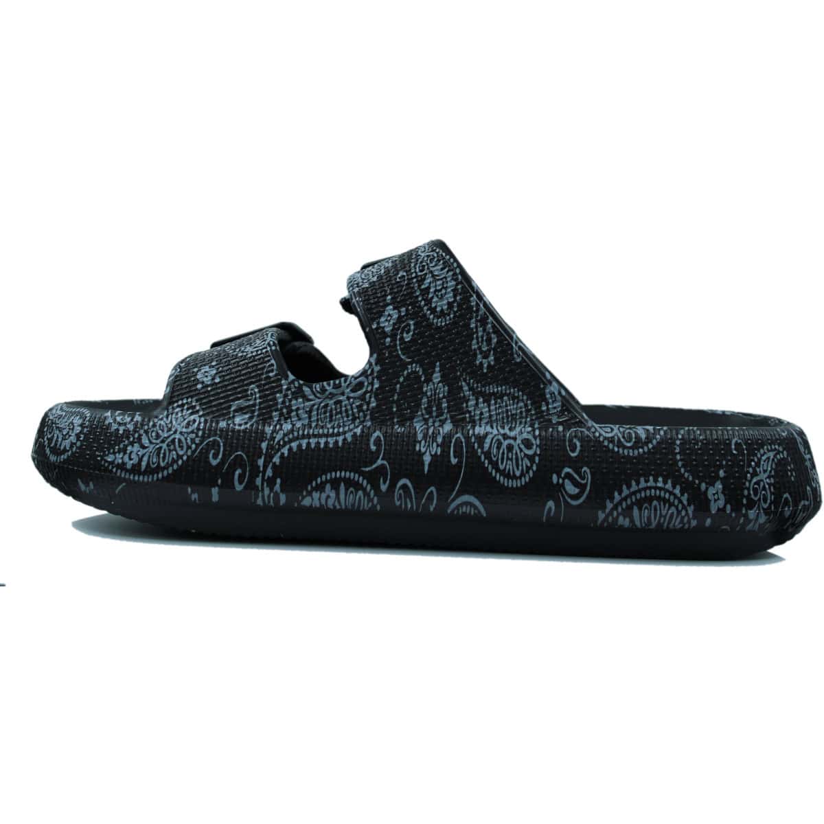 Γυναικεία σαγιονάρα με σχέδιο και δύο φάσες. Ρυθμίζεται με αγκράφα για καλή εφαρρμογή στο πόδι. Ιδανική για παραλία και καθημερινή χρήση. Ανατομικό πέλμα και αντιολισθητική σόλα. Ύψος τακουνιού 3,5cm.